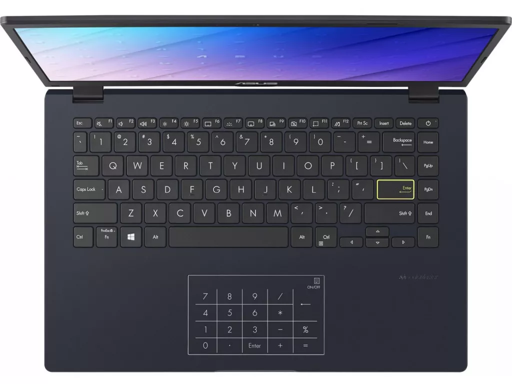 Ноутбук ASUS Laptop E410 выделяется внешне среди других моделей своим юношеским задором, который проявляется в деталях его оформления: выделяющейся ярко-желтым клавише Enter и уникальном узоре на крышке, состоящем из элементов деконструированного логотипа ASUS.