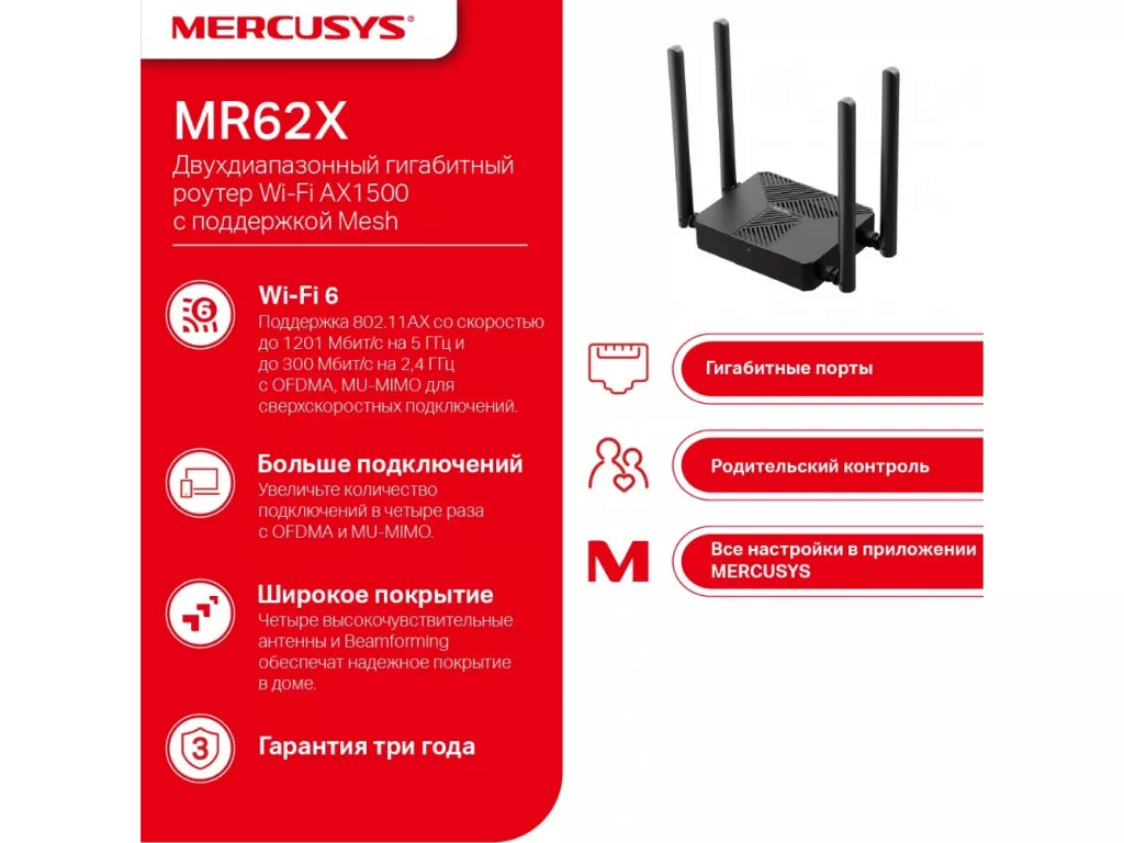 | Прочее | ➣ Обновите свою сеть с помощью Wi-Fi 6 – MR62X оснащен новейшим стандартом Wi-Fi 6, что обеспечивает более одновременные соединения, расширяет радиус действия Wi-Fi и поддерживает надежную быструю передачу данных. ➣ Улучшенная пропускная способность сети OFDMA и MU-MIMO позволяют одновременно передавать данные на несколько устройств и с них, повышая общую эффективность сети. |
