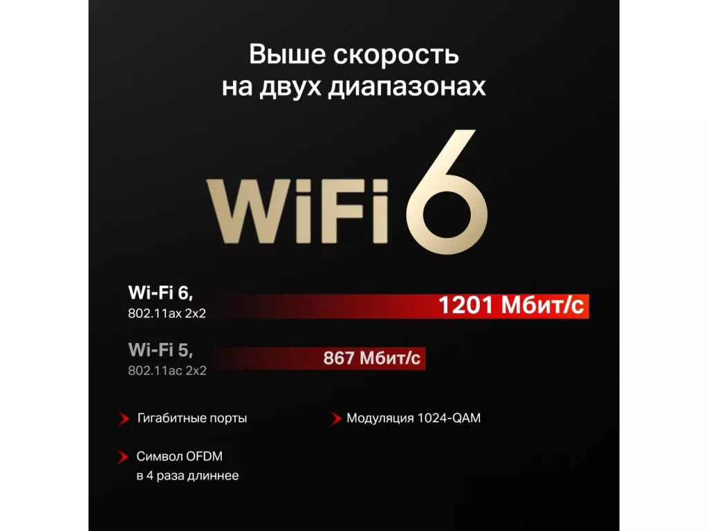 Беспроводной маршрутизатор (роутер) | Wi-Fi 802.11ax | Максимальная скорость 300 + 1201 Мбит/с (AX1500) | LAN-порт 1000 Мбит/с x2 | WAN-порт 1000 Мбит/с x1 | OFDMA | MU-MIMO
