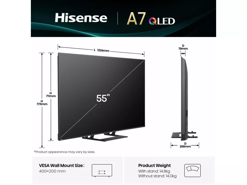 Диагональ 55" (139 см) | 4K Ultra HD (3840x2160) | Матрица VA 10 bit (8 bit + FRC) | HDR10 | Smart TV (на базе платформы VIDAA Smart OS) | Мощность звука 2 x 10 + 20 Вт | Dolby Atmos, DTS Virtual:X | Wi-Fi, Bluetooth, Ethernet | ТВ-тюнер DVB-T2/T, DVB-S2/S, DVB-C | HDMI x3, USB 2.0 x2 | Черный
